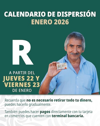 De acuerdo con el calendario oficial, este jueves 22 de enero reciben su pago los beneficiarios cuyo primer apellido inicia con la letra R. El depósito se realiza automáticamente en la Tarjeta del Banco del Bienestar, sin necesidad de realizar trámites adicionales.