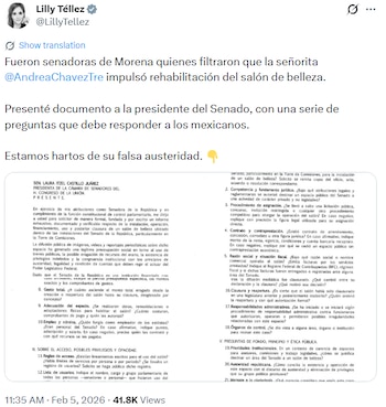 La polémica sobre un salón de belleza alojado en el Senado de la República sigue generando criticas por partidos de oposición. Este 5 de febrero de 2026 la senadora María Lilly del Carmen Téllez García, conocida como Lilly Téllez, publicó en su cuenta de X un mensaje acompañado de imágenes que corresponden a un documento presentado ante la mesa directiva del recinto legislativo, pidiendo mayor información sobre el tema.