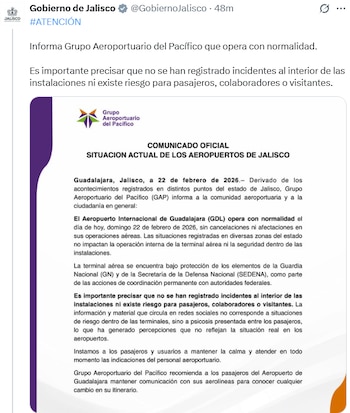 El Gabinete de Seguridad informó que los aeropuertos de Jalisco operan con normalidad. Los pasajeros están tomando sus vuelos conforme a lo programado y no se registra ningún evento relevante en las instalaciones.