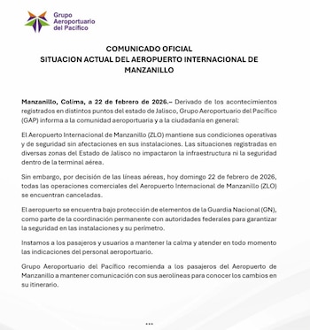 Mientras que el Grupo Aeroportuario del Pacífico (GAP) informó que, debido a una situación reportada en la carretera hacia el Aeropuerto Internacional de Manzanillo, se registron afectaciones en las operaciones aéreas este día.
