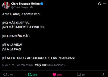 “¡No más guerra! ¡No más muerte a civiles! ¡Ni una niña más! ¡Sí a la vida! ¡Sí a la paz! ¡Sí al futuro y al cuidado de las infancias!”, escribió Brugada Molina, en referencia a la operación denominada “Furia épica” por Washington y “León Rugiente” por Tel Aviv, que en sus primeras horas ya reportaba explosiones en Teherán, Qom, Isfahán, Shiraz y otras ciudades iraníes.