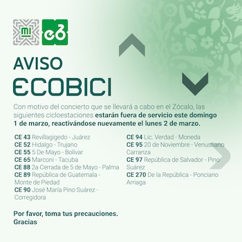 Con motivo del concierto de Shakira en el Zócalo, el sistema de bicicletas públicas de la Ciudad de México Ecobici informó que algunas cicloestaciones suspenderán operaciones de manera temporal, como parte de los operativos de seguridad y logística por el evento masivo.