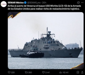 Hasta el momento no se ha precisado cuánto tiempo permanecerá en territorio nacional; en su visita anterior, la estancia fue de apenas 24 horas. El puerto de Veracruz recibió este sábado al USS Wichita (LCS-13), buque de combate litoral de la Armada de Estados Unidos, que realizó una visita de reabastecimiento logístico.