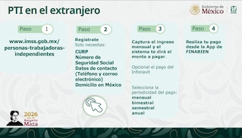 En la conferencia de prensa de este 19 de marzo de 2026, el gobierno federal presentó los avances del Programa de Trabajadores Independientes (PTI) en el exterior, una extensión del esquema de aseguramiento voluntario que ya existe en México y que desde 2024 está disponible para los mexicanos que viven fuera del país, principalmente en Estados Unidos.