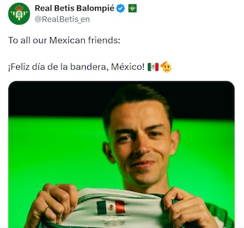A través de su cuenta oficial en X, el club andaluz escribió: “A todos nuestros amigos mexicanos ¡Feliz Día de la Bandera, México!”, junto a una fotografía en la que el mediocampista aparece mostrando una jersey edición especial con la bandera tricolor estampada en el interior, en alusión al vínculo que mantiene con el país.