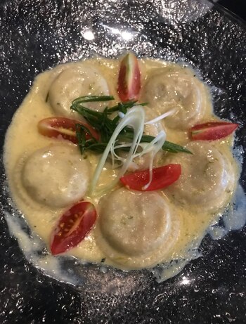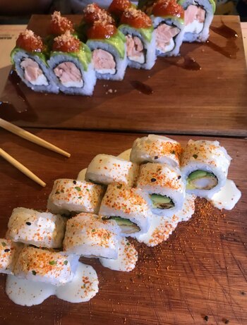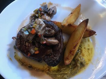 Presenta una carta más que variada, el sushi es uno de los más elegidos, pero resulta imposible dejar de probar los sorrentinos rellenos con salmón. Si de pesca se trata, el sugerido por Florencia, la encargada del lugar, fue el salmón crocante acompañado de un delicioso puré de papas especiado y aunque la Parillada Porteña es uno de los platos que mas sale, yo opte por el Ojo de Bife con papas crocantes.