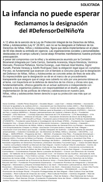 A 12 años de la sanción de la Ley de Protección Integral de los Derechos de Niños, Niñas y Adolescentes (Ley N° 26.061), aún no se ha designado el Defensor de los Derechos de Niñas, Niños y Adolescentes, figura que debía implementarse en el plazo de 90 días desde su entrada en vigencia. Las organizaciones sociales y personalidades destacadas en el campo cultural y social abajo firmantes manifestamos nuestra profunda preocupación.
