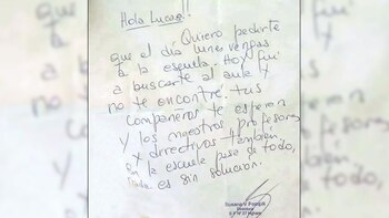 En este sentido la directora de la institución, Susana Pompili, envió una carta al menor, intentando que regrese a la escuela: "Hola Lucas, quiero pedirte que el día lunes vengas a la escuela. Hoy fui a buscarte al aula y no te encontré. Tus compañeros te esperan y los profesores, maestros y directivos, también. En la escuela pasa de todo, nada es sin solución".