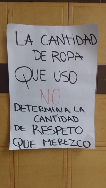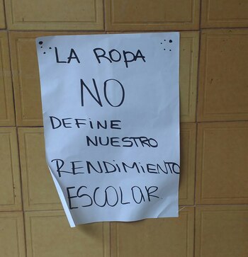 La alumna explicó que el código de vestimenta del colegio prohíbe ir con remeras con tiritas, aunque nunca aclara que no se puede asistir sin corpiño. Ante la insólita sanción y la falta de explicaciones por parte de la rectora, el resto de los estudiantes organizó una campaña para defender a Bianca y empapeló el establecimiento con distintos mensajes en apoyo. "La cantidad de ropa que uso no determina la cantidad de respeto que merezco" o "la ropa no define nuestra capacidad" fueron algunas de las inscripciones que los alumnos pegaron en las paredes.