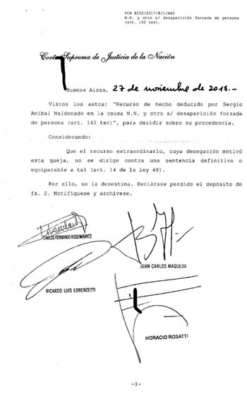Casi de manera simultánea, la Corte Suprema de Justicia de la Nación rechazó por cuestiones formales un recurso extraordinario planteado por Sergio Maldonado en el que requería que una comisión interdisciplinaria independiente interviniera en la investigación penal por la desaparición de Santiago Maldonado.