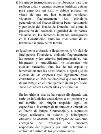 El ex funcionario, quien por orden de la FGR fue cesado de ocupar cargos públicos durante 10 años, también expresó su inconformidad debido a que sus representantes legales solicitaron una copia del expediente en donde se le acusa y el cual no ha sido entregado. "Esta ilegalidad por parte de la FGR es inaudita, ya que es un derecho de cualquier ciudadano conforme a la nueva ley, para poder defenderse ante supuestos ilícitos", manifestó en el documento.