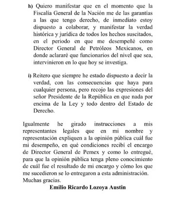 En el documento compartido en redes sociales, el ex director de Pemex dijo que ha instruido a su equipo de representantes legales que trabajen en garantizar un justo proceso que lo hagan sentir seguro para que él pueda continuar participando en la investigación.