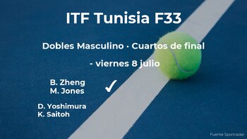 El chino Baoluo Zheng y el jugador tailandés Maximus Jones ganaron en los cuartos de final del torneo ITF Tunisia F33 porque no se pudieron presentar sus oponentes, los japoneses Daiki Yoshimura y Keisuke Saitoh. Tras este resultado, podremos seguir viendo a los ganadores del partido en la siguiente fase del torneo ITF Tunisia F33, las semifinales.