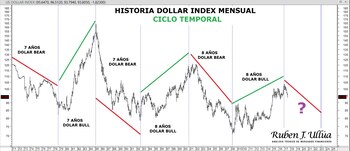 En efecto, esta idea de piso expuesta en su oportunidad para la baja del euro no sólo se llega por el accionar que había tenido la moneda a lo largo de los últimos ocho años, sino porque la condición técnica de piso que alcanzó el euro en esas instancias de mínimo a la vez coincidía con la finalización de un ciclo temporal histórico que viene acarreando el Dollar Index desde sus inicios, en el año 1971, que nos indicaba la posibilidad de que hacia el pasado año 2016 debíamos ver el nivel más alto del ciclo de recuperación del dólar frente a la canasta de monedas internacionales. Dado que el euro es la moneda de mayor ponderación sobre ese índice, las condiciones estaban dadas para considerar que tanto el Dollar Index comenzaría a recortar parcialmente las ganancias como el euro iniciaría la recuperación parcial de las pérdidas sufridas desde el año 2008.