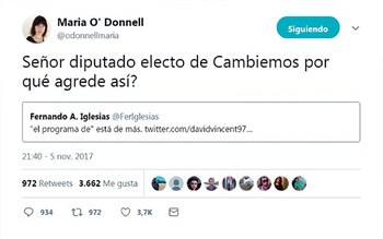 En qué sentido la frase de mi tweet ("'El programa de' está de más") puede ser considerada intimidante o falsa es algo que Amnesty no aclara. Lo hago yo: todo comenzó con un mensaje de @davidvincent97 que twiteó: "Que desastre el programa de O'Donnell", al que yo señalé que sobraba "el programa de…". He allí la magnitud del "ataque intimidatorio": decir que María O'Donnell me parece un desastre periodístico; afirmación a la que agrego ahora mi tweet siguiente, que le envié: "No es una agresión, María. Es una opinión. Creo que tu forma de hacer periodismo es desastrosa. La vara de África por doce años. La de Suiza, hoy". La definición teórico-práctica de la línea periodística de Corea del Centro.