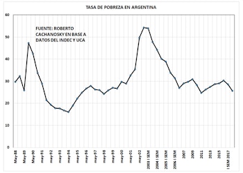 Si tomamos desde mayo de 1988 hasta el segundo semestre de 2017 tenemos casi 30 años con una pobreza que, salvo en 1994 en que bajó hasta el 16%, se mantuvo en un promedio del orden del 25% con los picos mencionados.