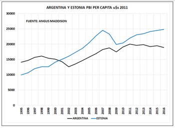 Luego de la caída del muro de Berlín, nosotros teníamos un ingreso per capita, de acuerdo a los datos de Angus Maddison, que superaba en un 42% al de Estonia; en 2016 esa brecha se revirtió al 32% a favor del país europeo, luego de que nos empezara a superar en 2001, y sacó amplias ventajas a partir de 2011, segundo mandato de Cristina Fernández de Kirchner.