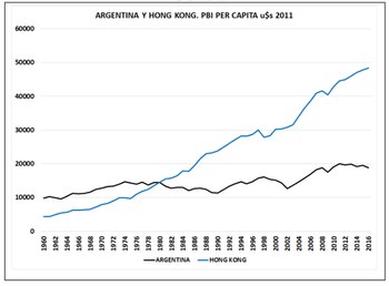 En 1960, nosotros, los genios del vivir con lo nuestro y el intervencionismo, teníamos un ingreso per capita que superaba en un 126% al de Hong Kong. En 2016, siempre en base a los datos de Angus Maddison, el país asiático sacó una ventaja del 156%; semejante giro es lo que pudo lograr la libertad económica versus el intervencionismo, el estatismo, la economía cerrada y las regulaciones junto con el populismo económico.