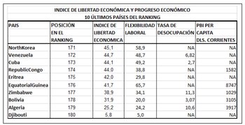 Si tomamos los 10 países con menos libertad económica, es decir los que están en el final de la tabla, observamos que en tasa de desocupación hay escasa información y lo mismo ocurre con algunos casos del ingreso per cápita que, para los países que disponen de información, están a años luz de los 10 primeros países de la tabla.