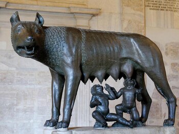La segunda: Rómulo y Remo, hijos de Rea Silvia (sacerdotisa vestal de Alba Longa con votos de castidad) y el dios Marte, quien de paseo por la Tierra la poseyó mientras dormía. Los mellizos, no gemelos, fueron depositados en otra canasta y arrojados al río Tíber. La canasta se enredó en juncos de la orilla en las cercanías de lo que hoy en Roma se llama colina Palatina (una de las siete de la ciudad) y allí quedaron varados llorando desconsoladamente. El llanto fue escuchado por una loba que los amamantó luego de sacarlos de la canasta y logró que sobrevivieran. Otra versión cuenta que en realidad la loba era una prostituta del lugar, las tribus sabinas y latinas llamaban a las meretrices "lupa" ('loba') y al lugar donde ejercían, "lupanar". La prostituta Aca Larentia y su marido, el pastor Fáustulo, criaron a los mellizos. Sin ellos, los padres sustitutos, Rómulo y Remo, hubieran muerto y la historia que hoy conocemos hubiera sido otra.