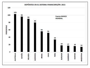 Si tomamos el total de depósitos respecto al PBI, de acuerdo a datos del Banco Mundial, el promedio mundial está en el 50%; la media de Latinoamérica y el Caribe también es de 50%; y seleccionando algunos países, se puede ver que la Argentina está con las proporciones más bajas, incluso por debajo de Uganda, Camerún y Burundi.