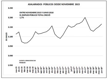 Si tomamos el período de Cambiemos, comparando junio 2018 contra noviembre 2015, el empleo privado en relación de dependencia cayó el 0,7% y el empleo público aumentó el 1,7 por ciento.