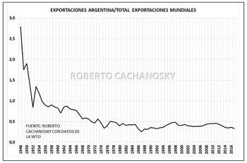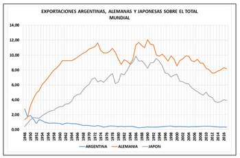 En 1948, a tres años de haber finalizado la Segunda Guerra Mundial, todavía bajo los escombros y reconstruyendo sus economías, Alemania exportaba el equivalente al 1,35% del total de las exportaciones del mundo y Japón el 0,44%. Argentina, 2,8 por ciento. En 2017, Alemania exportaba el 8,2% del total global; Japón, 3,9%; y Argentina, 0,3 por ciento. Lo que exportaba Japón después de la guerra lo pasamos a exportar Argentina en 2017.