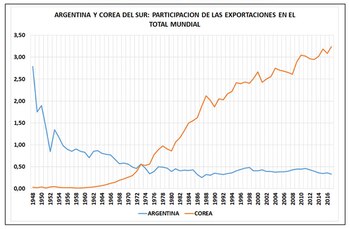 Si a Argentina y Corea del Sur entre 1948 y 2017, se ve cómo se cruzan las curvas. En 1948 exportábamos el 2,8% de las exportaciones mundiales y Corea sólo el 0,03%. En 2017, exportamos el 0,33% de las exportaciones mundiales y Corea el 3,24% del total.