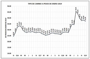 El gráfico muestra la evolución del tipo de cambio a pesos constantes de enero de 2019 desde noviembre 2015 que fue el último mes completo del gobierno kirchnerista. En otra escala, pero está repitiéndose el mismo dibujo que cuando se salió del cepo cambiario en diciembre de 2015.