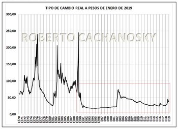 Si uno toma los últimos 48 años de evolución mensual del tipo de cambio real a pesos de enero de 2019, se encuentra con que está en uno de los puntos más bajos de la serie histórica, quitando los picos del 75, de la crisis del 82 y de la hiperinflación del 89. Sin embargo, este tipo de cambio actual que está algo más alto que el de enero de 1981 con el fin de la tablita cambiaria de Martínez de Hoz y del fin de la convertibilidad, no responde a reformas estructurales que hayan generado un flujo de inversiones en el sector real de la economía ni a una explosión de exportaciones que justifiquen su baja respecto a períodos anteriores.
