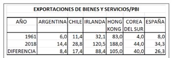 Por ejemplo, mientras la Argentina incrementó la relación entre las exportaciones y el PBI en 8,4 puntos porcentuales entre 1961 y 2018, Chile, con la apertura comercial, la duplicó, subió 17,4 pp; Irlanda 88,4 pp; Hong Kong 105 pp; Corea del Sur 40 pp y España 26,3 puntos porcentuales.