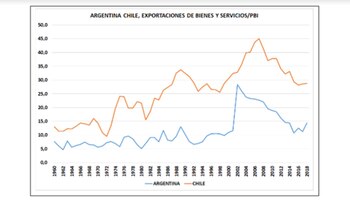 Mientras que en el gráfico puede observarse cómo evolucionaron las exportaciones de ambos países entre 1961 y 2018. Chile toca un pico del 45% por el precio de las materias primas por sus exportaciones de cobre, mientras que la Argentina, exportando también commodities llega a un pico de 22,3% en ese año.