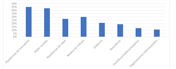 Entre los encuestados, los motores de búsqueda, como Google, son tan confiables como los medios de noticias. En cambio, solo cinco de cada diez encuentra las plataformas de video confiables, y esa proporción desciende a cuatro de cada diez para redes sociales y plataformas de mensajería como WhatsApp.