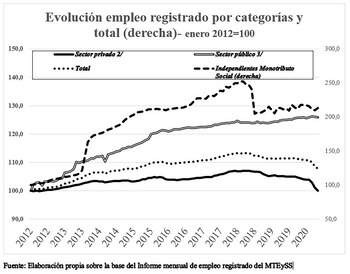 Hay otras informaciones que –afortunadamente- no tuvieron estas variaciones en el tiempo. Por ejemplo las estadísticas del Ministerio de Trabajo sobre empleo registrado. Desde enero de 2012 existe una serie que cubre a todos los asalariados registrados (privados, públicos, domésticos) y al resto en una clasificación que no siempre es clara pero que en conjunto incluye a los pequeños empresarios y cuentapropistas.