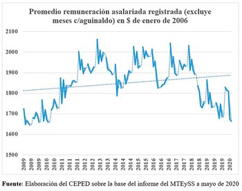 El gráfico muestra la evolución desde enero de 2012 hasta mayo de 2020. Allí se percibe la sensible caída en el sector privado (y en el agregado total) en los primeros meses de este año. Este derrotero seguramente se explica en parte por la situación crítica de arrastre como, especialmente, por los efectos de las medidas sanitarias adoptadas que tuvieron enorme impacto en una virtual paralización de gran parte de la actividad económica.