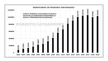 Clientelismo político también es haber llevado de 81.539 beneficiarios por invalidez laboral a 1.032.926, como puede verse en el gráfico. Casi un millón más sin haber tenido una guerra, un terremoto o un tsunami. Este programa tiene un costo de $156.487 millones para 2020, según el Presupuesto.