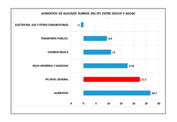 El gráfico precedente muestra la evolución de alguno de los rubros del IPC. Por ejemplo, con una inflación del 22,5% entre noviembre de 2019 y agosto 2020 la Electricidad, Gas y Otros Combustibles acusaron una baja del 1% y el transporte público crece solo 9,4% y combustibles 11%. Llama la atención el bajo aumento del rubro alimentos del 26,7% en los 9 meses considerados.