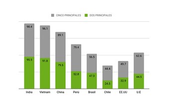 En 2019 las exportaciones a tres destinos emergentes, China, India y Vietnam, ubicados dentro de los seis primeros mercados externos, mostraban un nivel de concentración medido por la participación de los primeros cinco productos de 94,5 por ciento.