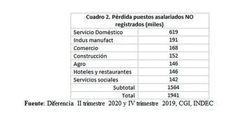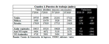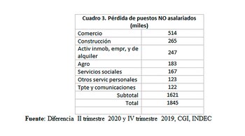 Son estos dos componentes, precisamente, los que dan cuenta de la casi totalidad de la pérdida de puestos laborales en 2020: de los 4,1 millones perdidos, sólo 300.000 corresponden a la caída de los asalariados registrados. El resto son puestos precarios (1,9 millones) y de no asalariados (1,8 millones).