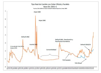 El gráfico muestra la evolución del dólar blue a valores constantes, con un punto más alto en la hiperinflación en el último tramo del gobierno de Raúl Alfonsín, con un índice base 1 en diciembre de 2001, toca 6,43 puntos a mediados de 1989, luego una baja de corto recorrido vuelve a rebotar en el pico inflacionario de 1990 con un índice de 5,12 y en octubre último volvió a marcar otro valor extremo de 4,35 unidades.