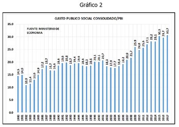 Si se toma el gasto público social del gobierno nacional como porcentaje del PBI, pasó de 9% del PBI en 1980 al 17% en 2017. Se duplicó. En 1980 el gasto público social representaba el 47% del gasto público de la nación y en 2017 esa participación se había elevado al 66 por ciento.