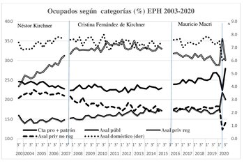 Todos estos valores que mostraban una preocupante declinación, saltaron por el aire en 2020. En solo nueve meses, se destruyeron 2,4 millones de puestos de trabajo la mitad de los cuales fueron asalariados no registrados. Otro tercio de las pérdidas corrió por cuenta de los no asalariados.