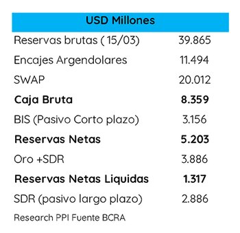 Ahora bien, para responder la primera pregunta y ver las reservas netas hoy, se debe partir de las brutas. Estas suman unos USD 39.865 millones, y claramente distan mucho de ser la caja propia de la entidad que preside Miguel Pesce.