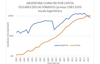 El gráfico compara la evolución de los ingresos por habitante en dólares en Argentina y China. Al inicio de la democracia, en 1983, y a pesar de las terribles pérdidas del trienio anterior, los ingresos argentinos superaban en más de 13 veces a los chinos. En 2020, eran 25% menores.