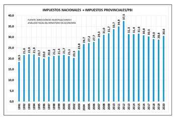 La estadística oficial revela que es a partir de la llegada del kirchnerismo al gobierno central en 2003, la carga tributaria, medida como recaudación impositiva/PBI, comienza a aumentar hasta llegar a un pico del 37,5% en 2013. Luego baja un par de puntos durante la gestión de Mauricio Macri, hasta 28,8% del PBI y en 2020 vuelve a incrementarse, casi en dos puntos porcentuales. Lo concreto es que entre 1991, cuando se lanzó el régimen de convertibilidad, fija entre el peso y el dólar, y 2020, aumentó 12 puntos porcentuales del PBI y sin embargo la salud pública es un desastre, la educación pública brilla por su ausencia y la seguridad casi no existe.