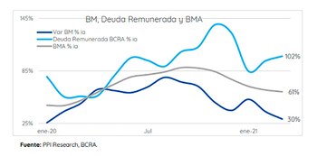De hecho, este juego se acentuaría en los próximos meses debido a que las dos de las tres fuentes de expansión monetaria (compra de divisas e intereses de Leliq y Pases) se mantendrían “prendidas”. Además, no habría lugar para proyectar una fuerte demanda de base monetaria, a similitud del II trim-20. Sin ASPO (aún con la nueva ola de contagios que se está desarrollando), no habría demanda preventiva de dinero.