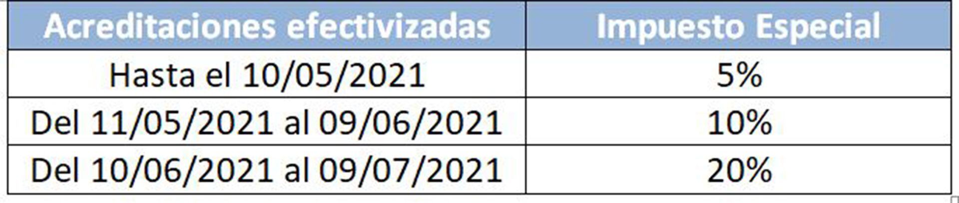 Por su parte, quien tenga los fondos en la Argentina tiene 6 días hábiles: desde el lunes 3 de mayo, si los Bancos habilitan las cuentas especiales CECON.Ar, hasta el lunes 10 de mayo de 2021, inclusive.