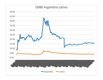 El gráfico describe la tremenda diferencia de rendimiento de los bonos del gobierno argentino y latinoamericanos. El enorme salto tras las PASO de agosto 2019 y las primeras actuaciones del nuevo gobierno; luego la brecha se redujo, aunque todavía es más del doble que entonces.