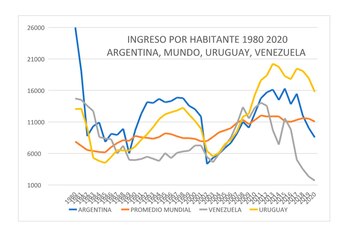 En América, sólo Venezuela perdió más: su ingreso promediaba apenas 10% de lo obtenido en 1980. El ingreso promedio mundial en 2020 era 140% del de 1980, el uruguayo 120%, a pesar de la fuerte merma desde 2013. Estos datos exponen que el PBI por habitante promedio aumentó sus ingresos 4,3 veces, y el uruguayo 3,7 veces, respecto de la caída del argentino.
