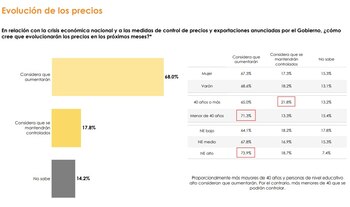 Y acá viene un dato fundamental: la evolución de los precios considerando la política del control de precios y de exportaciones. ¿Saben cuántos argentinos piensan que los precios van a aumentar en los próximos meses? El 68%. Es tremendo este número porque el Gobierno rompió la grieta.